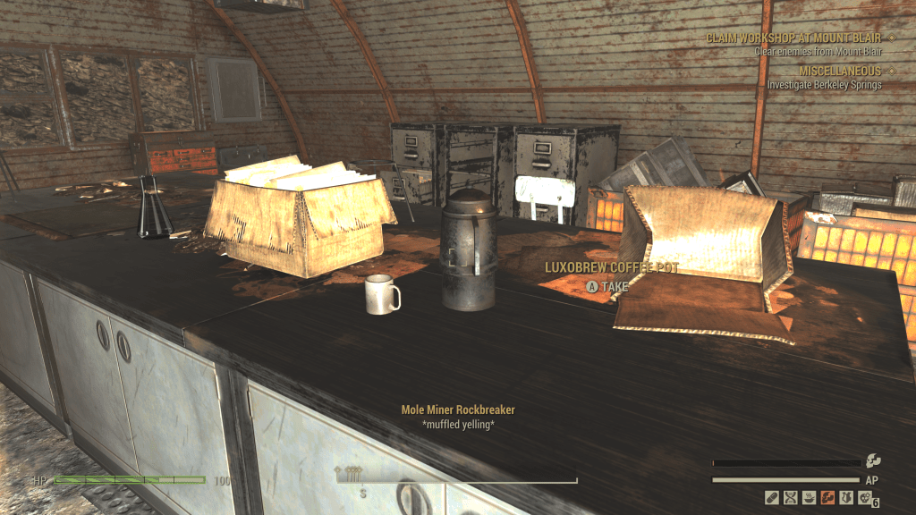 The Untarnished Coffee Pot is an undented version of the Coffee Pot. It can easily be found on the Overseer’s stove (be sure to wear a disguise if you’re a ghoul).