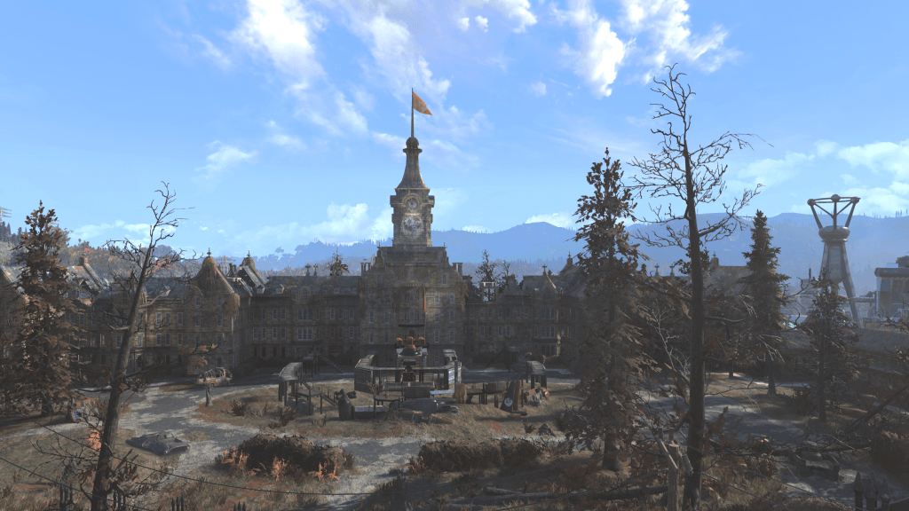 Construction of the Trans-Allegheny Asylum for the Insane (also referred to as the Trans-Allegheny Lunatic Asylum) began in 1858, built with stones quarried by prisoners and built by masons brought to the area from Germany and Ireland. The centerpiece of the building, a tower with a Seth Thomas clock similar to that on the West Virginia University tower, was added in 1871. The building with all additions was completed in 1881.