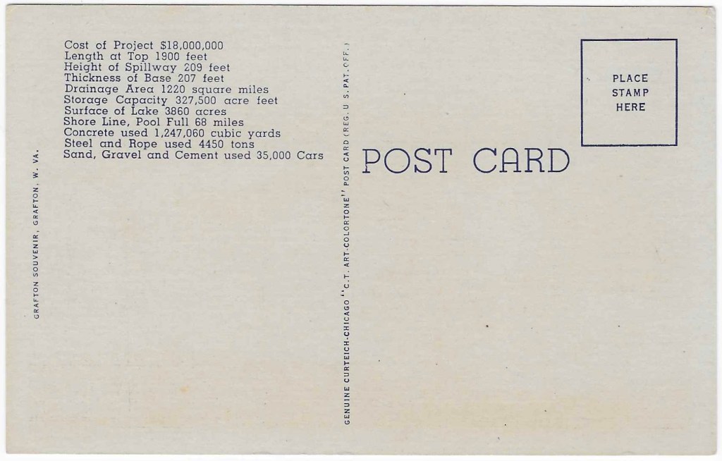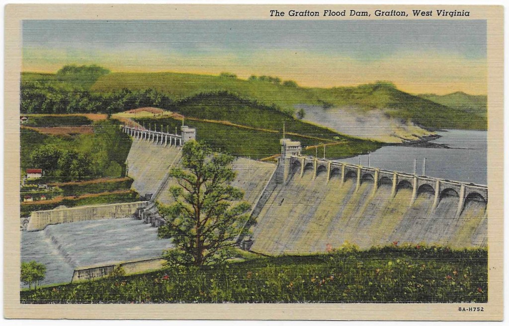 Officially known as Tygart Dam but sometimes referred to as the Grafton Flood Dam as shown in this postcard, the structure was constructed between 1935 and 1938 to combat both major flooding and severe droughts in the area.